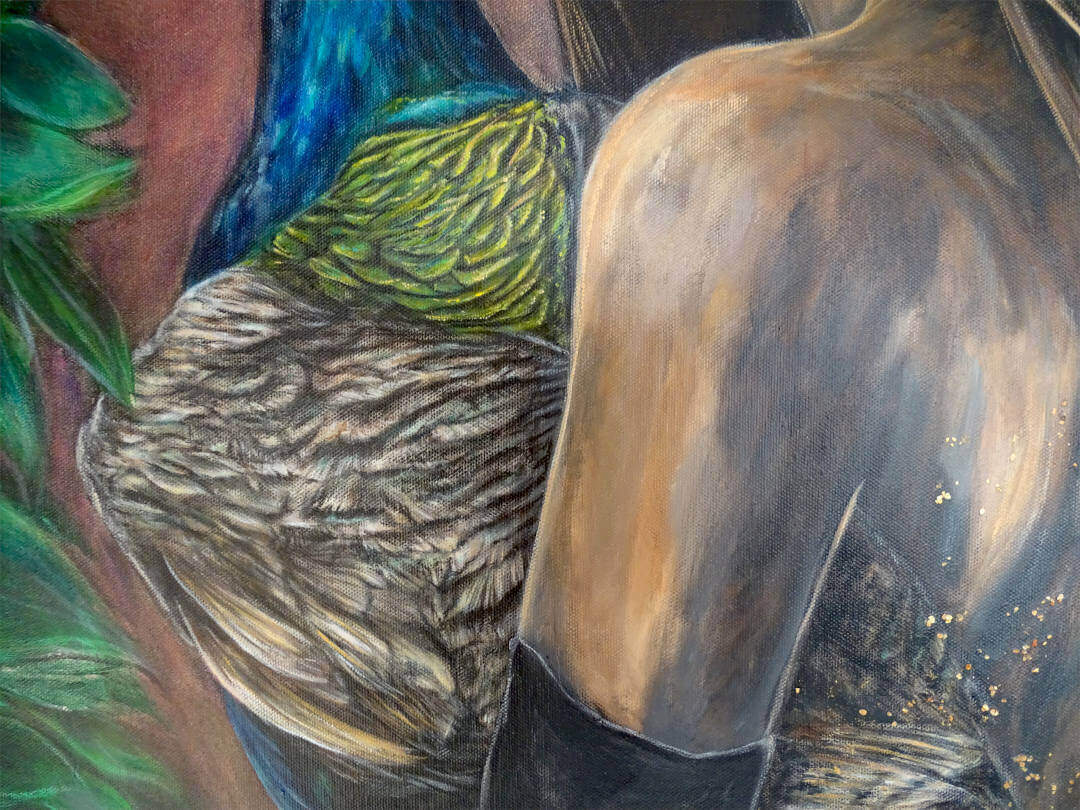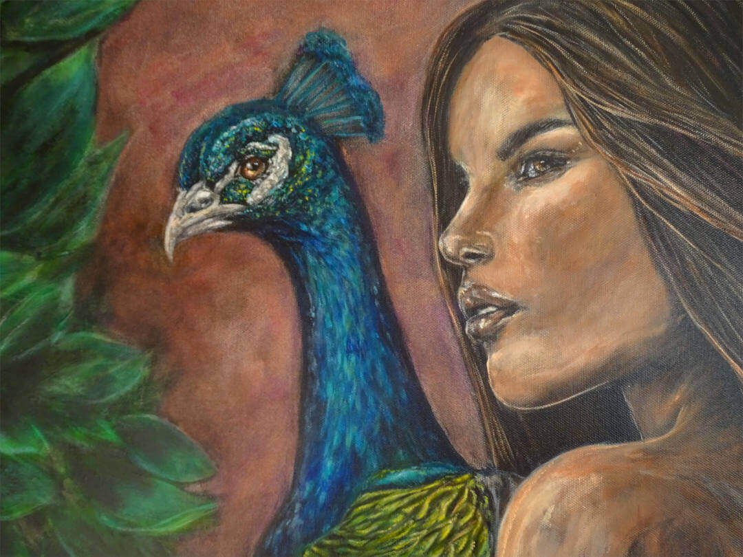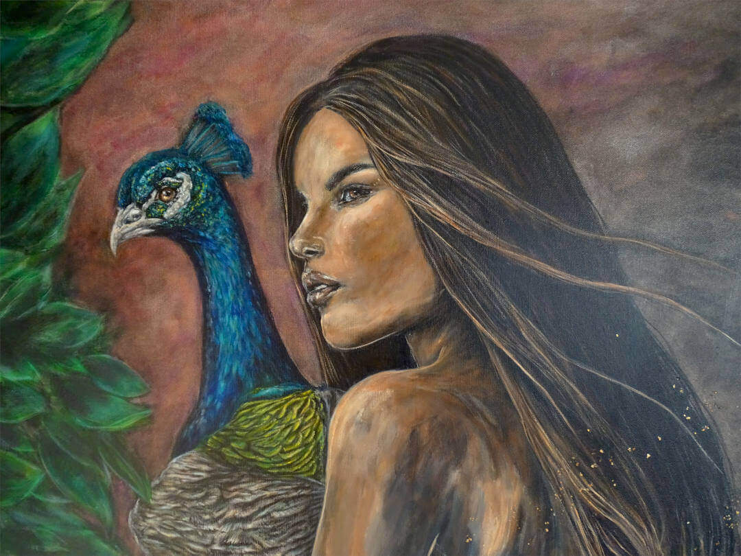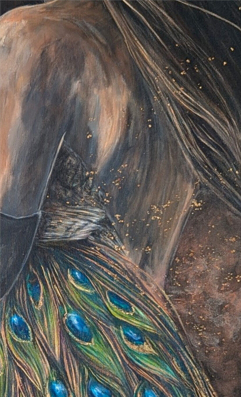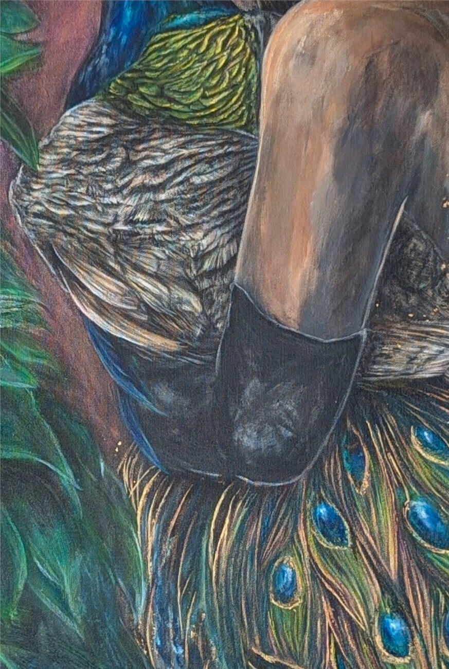 Unmasked“ erzählt vom Weg der Selbstbestimmung und Authentizität. Es ist das Loslösen von Erwartungen, die einen zurückhalten, symbolisiert durch die Blätter, die den Hintergrund bilden. Der Blick des Pfaus, stolz und unerschütterlich, erinnert daran, dass wahre Würde nicht im Gefallen liegt, sondern im festen Bleiben bei sich selbst.
